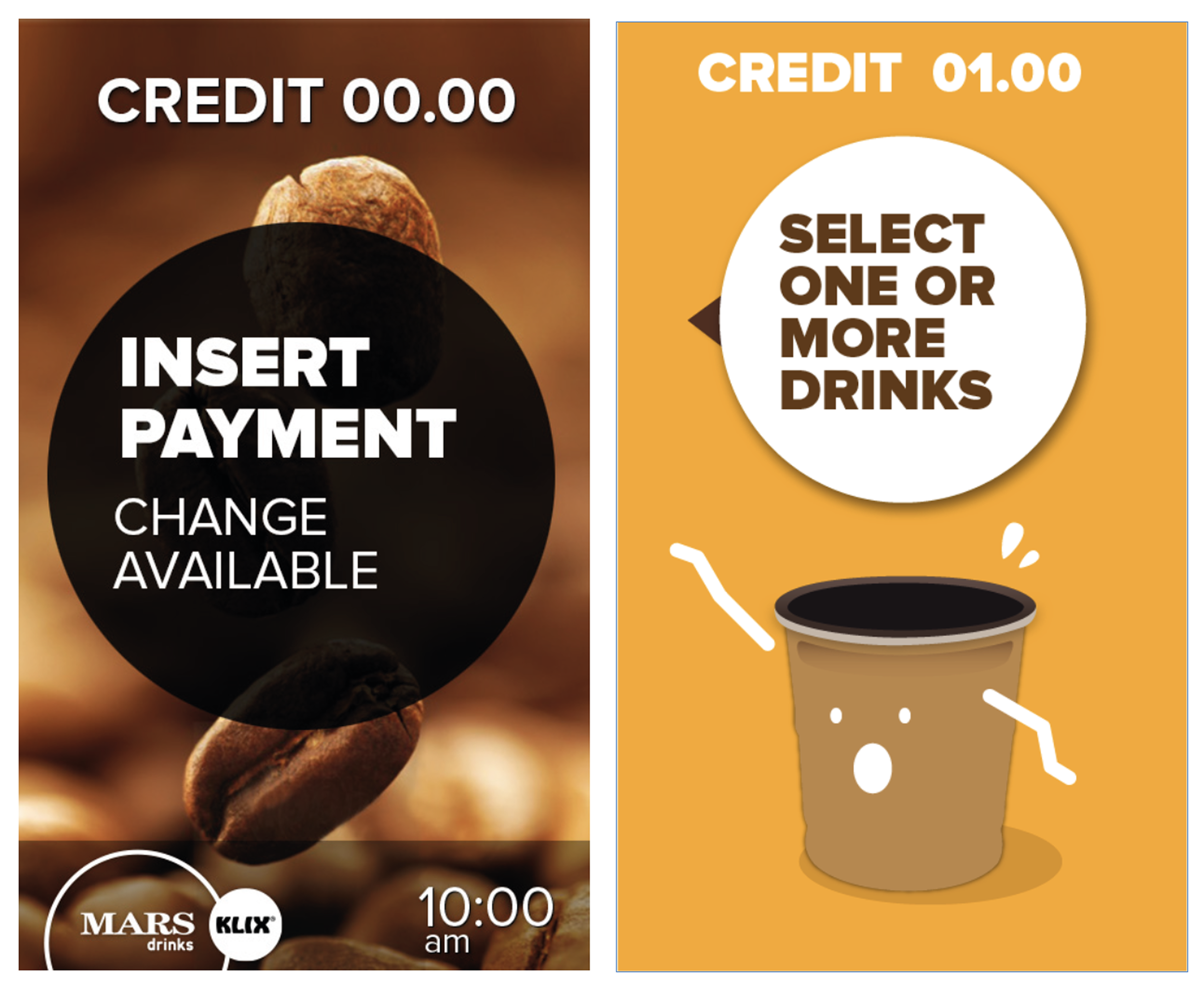 I worked on this project when I was working for the product consultancy Kinneir Dufort. The goal for the client, Mars Drinks, was to integrate a digital screen at the front door of a vending machine.